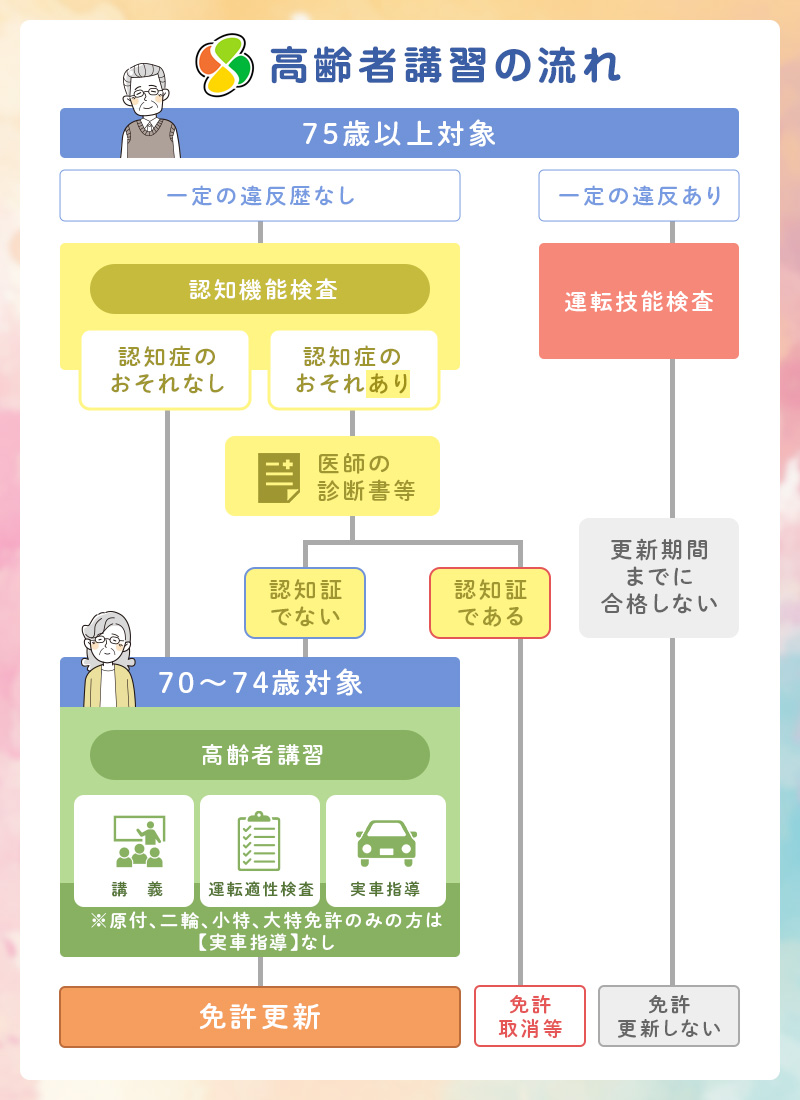 高齢者講習等受講通知書に記載のある区分に応じて、必要な検査・講習を受検・受講していただきます。